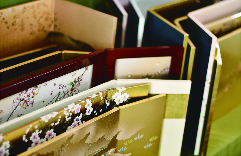 フッーと息を吹きかけると、飛んでいってしまうほど軽くて薄い箔を扱う職人は経験と手先の器用さ、丁寧さが求められます。 節句業界ではこれまで金箔を使用することが多かったのですが、最近では金箔の他にも銀箔や銅箔もよく使用します。 銀に特殊な加工を施した青貝箔や赤貝箔なども渋いです。 現在では飲食店やホテルなどでも時折見かけるようになりましたが、衣・食・住の観点からみても箔の可能性はまだまだ広がっていきます。